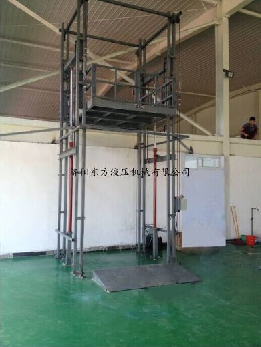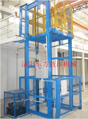 导轨式升降平台是一种垂直升降作业的简易升降平台。此设备采用液压油缸顶升、链条及钢丝绳拉动工作台,起升到目标高度后,通过限位开关自动与楼层平层。